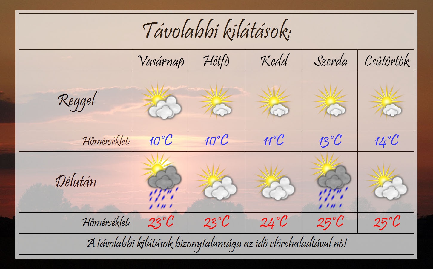 A jövő héten változékony, mérsékelten meleg idő vár ránk. Csapadékra csak elvétve kell számítani egy-egy záporeső kíséretében. Végig fog fújni a szél észak felől, mely miatt nem igazán melegszik fel a levegő. Reggelente 10-15°C valószínű, míg délutánonként kellemes 23-25°C -ig melegszik majd a levegő