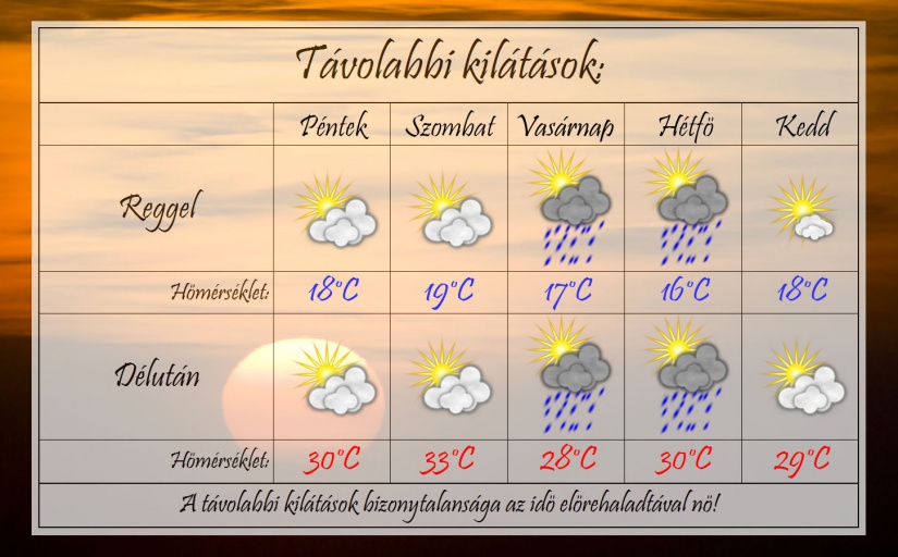 A hétvégén, szombaton lesz a legmelegebb. Akkor akár 33°C is lehetséges, majd vasárnap hidegfront érkezik. Többórás napsütésre is számíthatunk. Vasárnaptól többfelé lehetnek záporok és zivatarok. Komolyabb hőhullámtól nem kell tartani, azonban a strandidőt gyakran zavarják majd záporok, zivatarok és a jövő hét első felében átvonuló sekély ciklon.