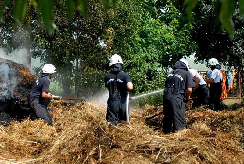 A tűz veszélyt jelentett a közeli gabona táblára. A tűzoltók szétbontották a bálákat, két vízsugárral és kéziszerszámokkal eloltották az izzó részeket.