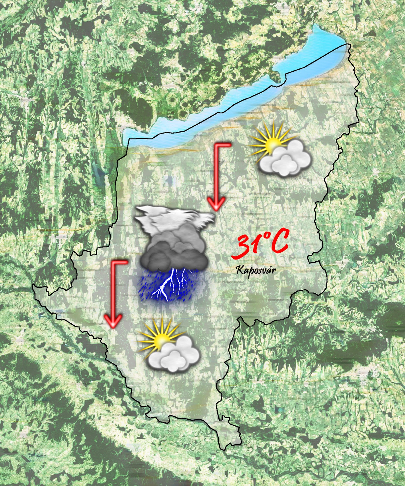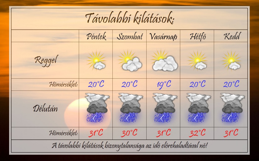 A hétvégén nagyobb számban fordulhat elő zápor zivatar. 28-33 °C lesz délutánonként a hőmérséklet, míg reggelente 18-20 °C-ig hűl a levegő. Igazi nyári idő várható, azonban a zivatarok többször szabotálják majd a strandidőt. A nyugtalan, zivataros időt egy sekély ciklon szolgáltatja, mely egész Közép-Európára kiterjed.