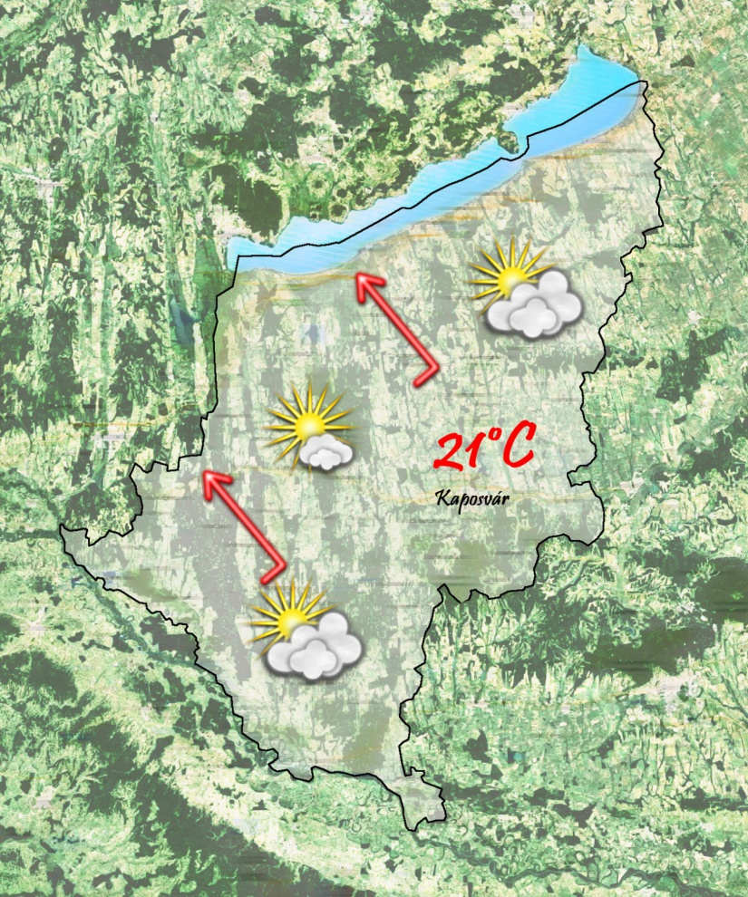 Kedd reggelre közepesen fátyolfelhős lesz az ég. 6°C-ig csökken a hőmérséklet. Napközben sok napsütésre számíthatunk, de lehetnek gomolyfelhők is. Délutánra 21°C-ig melegszik a levegő hőmérséklete. Gyenge délkeleti szél fúj majd.