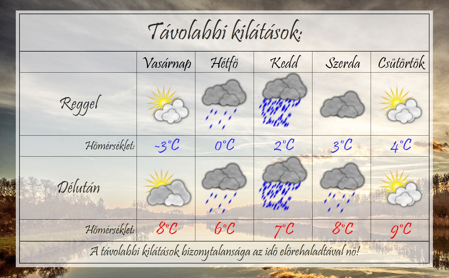 Szombat reggelre -2°C-ig hűl a levegő. Néhol előfordulhat köd. Napközben főként fátyolfelhők szűrik a napsütést. Délutánra csak 8°C-ig emelkedik a levegő hőmérséklete. Gyenge északkeleti szél fog fújni.