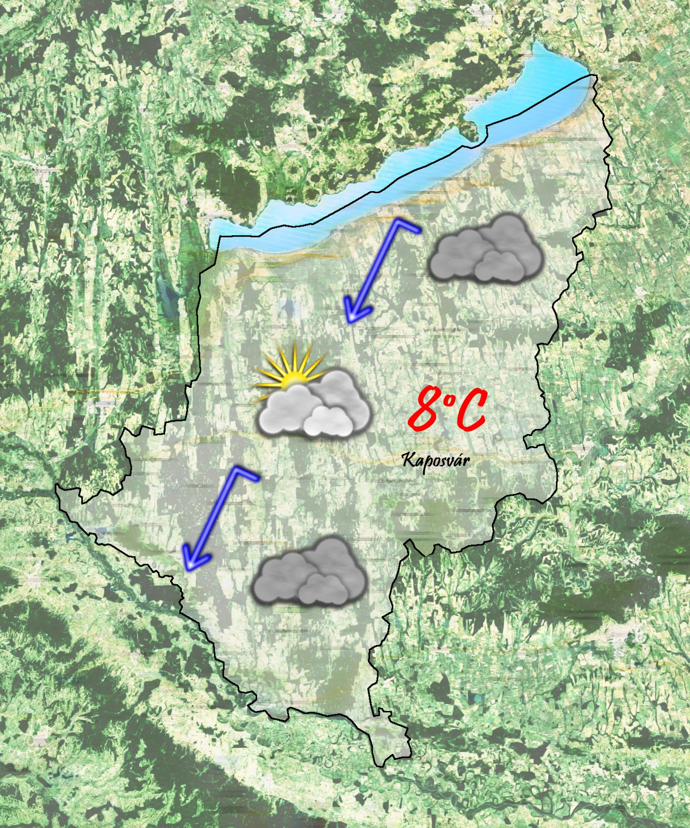Kedd reggelre 2°C-ig csökken a hőmérséklet. Délnyugat felől eső érkezik. Sokfelé csapadék. Néhol kiadós esőre lehet számítani. A nap második felében csökken a csapadékhajlam. Végig borult lesz az ég.. Délutánra 7°C-ig melegszik a levegő hőmérséklete. Mérsékelt északkeleti szél fúj majd.