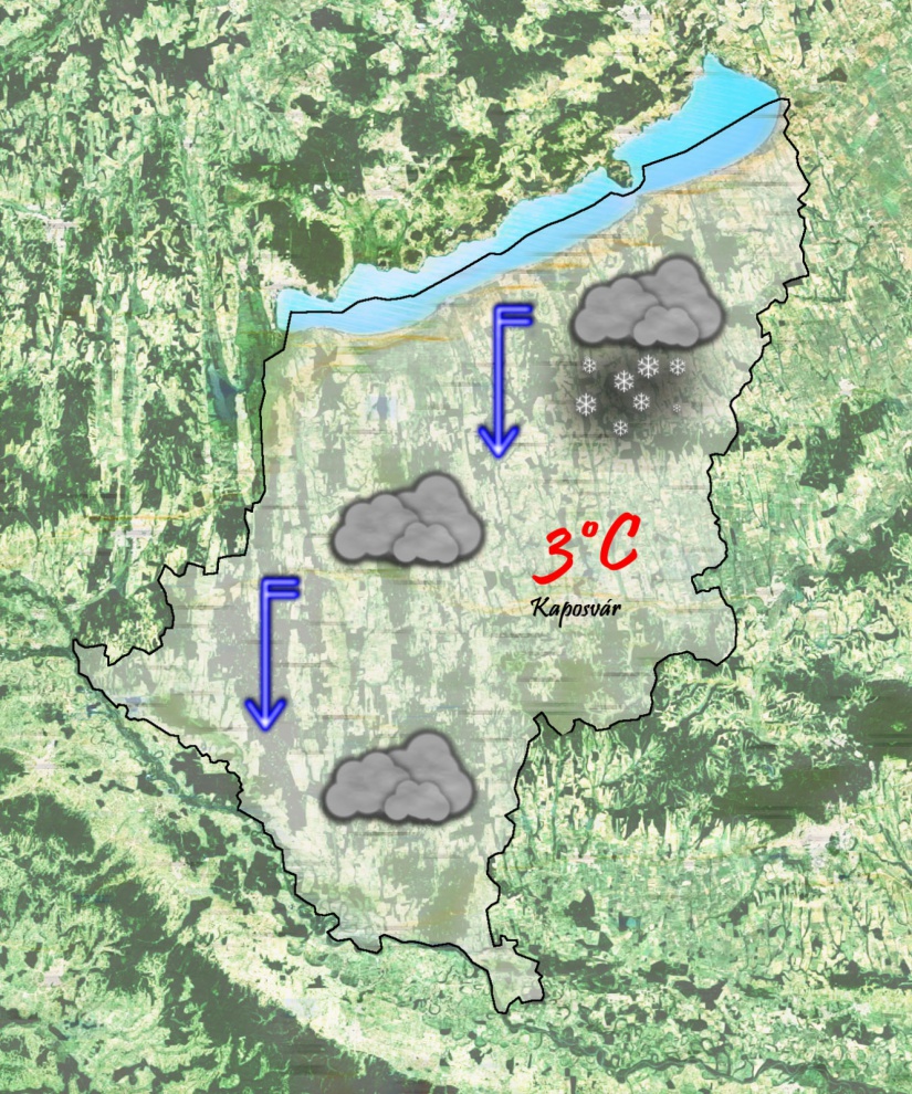 Kedd reggelre csökken a csapadékintenzitás és megélénkül az északi szél. Végig borult lesz az ég és alatta 1 °C-ig csökken a hőmérséklet. Délután már csak 3 °C-ig kúszik fel a hőmérő higanyszála. Havazásra csak a magasabban fekvő területeken kell számítani. Megmaradó hóra kevés az esély.