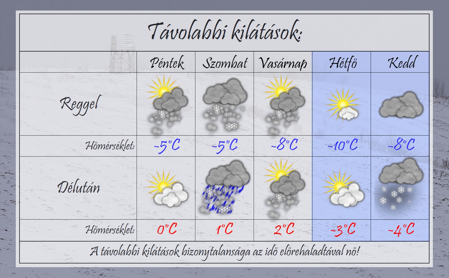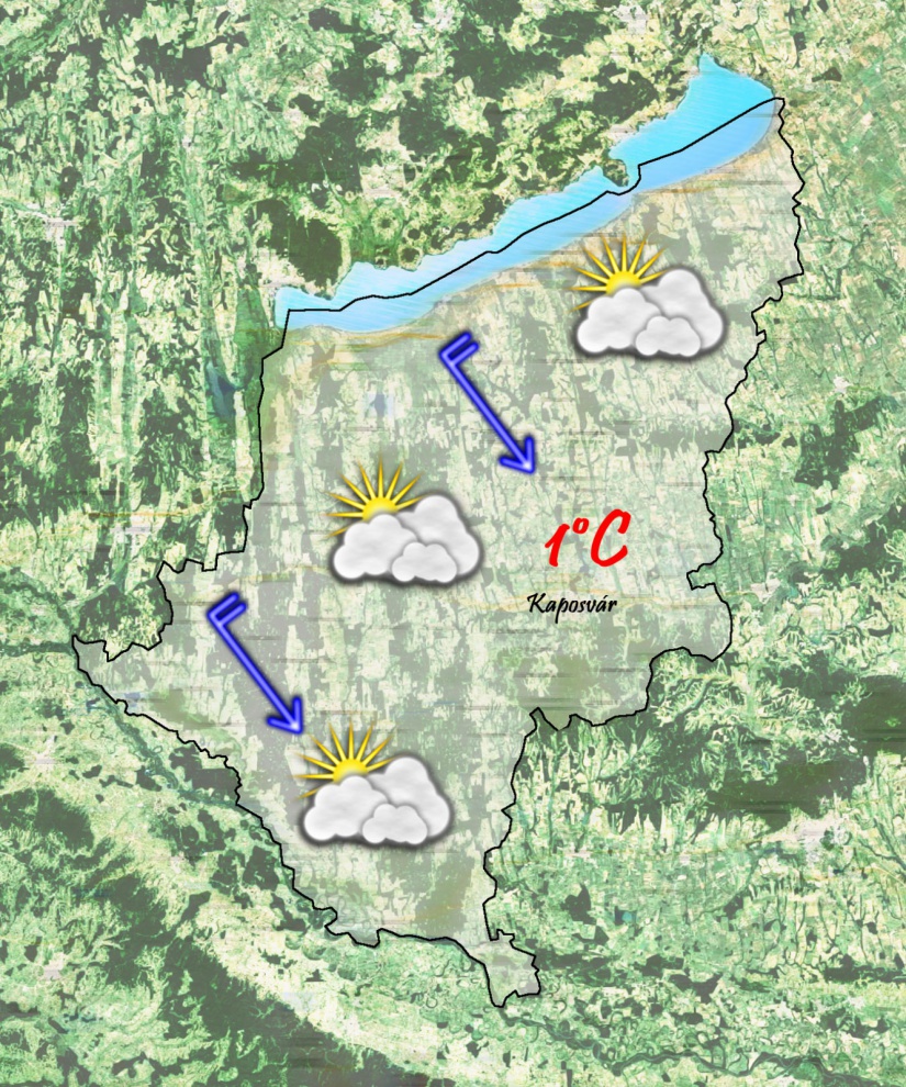 Csütörtök reggel a gyengén felhős ég alatt -3 °C-ig csökken a hőmérséklet. Napközben viszont sok lesz felettünk a felhő és előfordulhatnak hózáporok. Csak 1 °C-ig kúszik fel a hőmérő higanyszála. Továbbra is hideg északnyugati szél fúj majd.