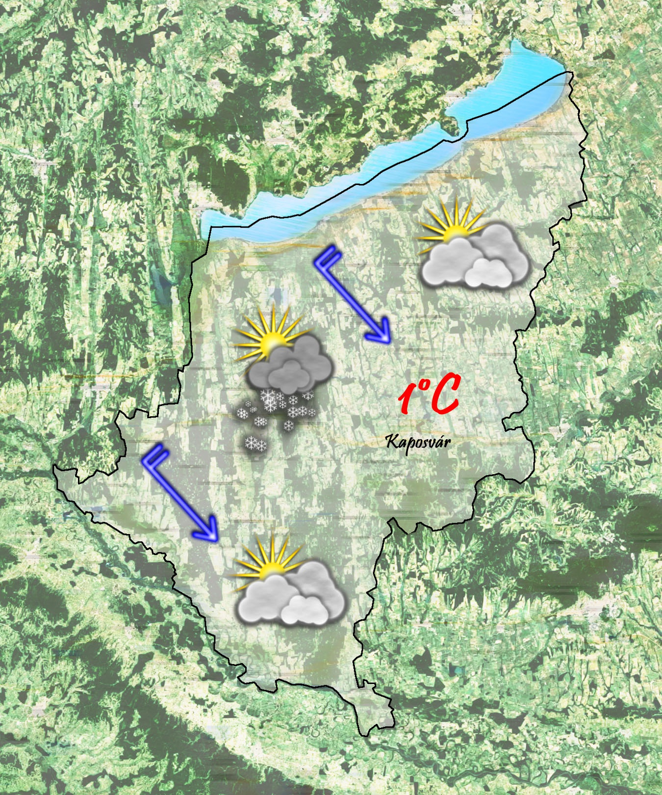 Szombat reggelre -4 °C-ig hűl a levegő. Borult lesz az ég és sokfelé kell számítani havazásra. Néhány centiméteres hótakaró kialakulhat. Délutánra 0 °C-ig emelkedik a levegő hőmérséklete. A magasban beáramló meleg levegő miatt viszont egyre többfelé vált át a havazás havasesőbe, esőbe. Megélénkülhet az északnyugati szél.
