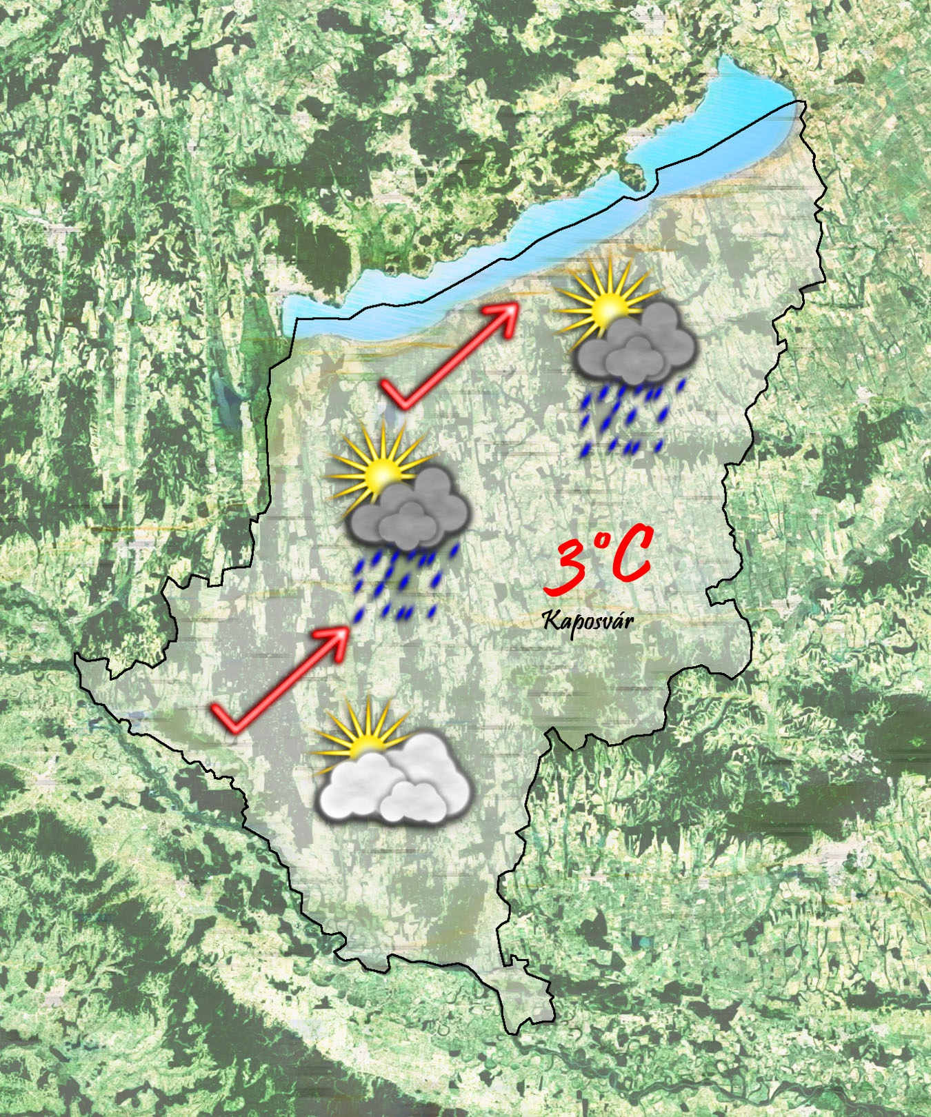 Pénteken reggel -6 °C várható. Eleinte gyengén felhős lesz az ég. Napközben megszaporodnak a felhők és este ismét lehet majd havaseső, havazás. Délután 1 °C-ig melegszik a levegő. Az északnyugati szél megélénkül.
