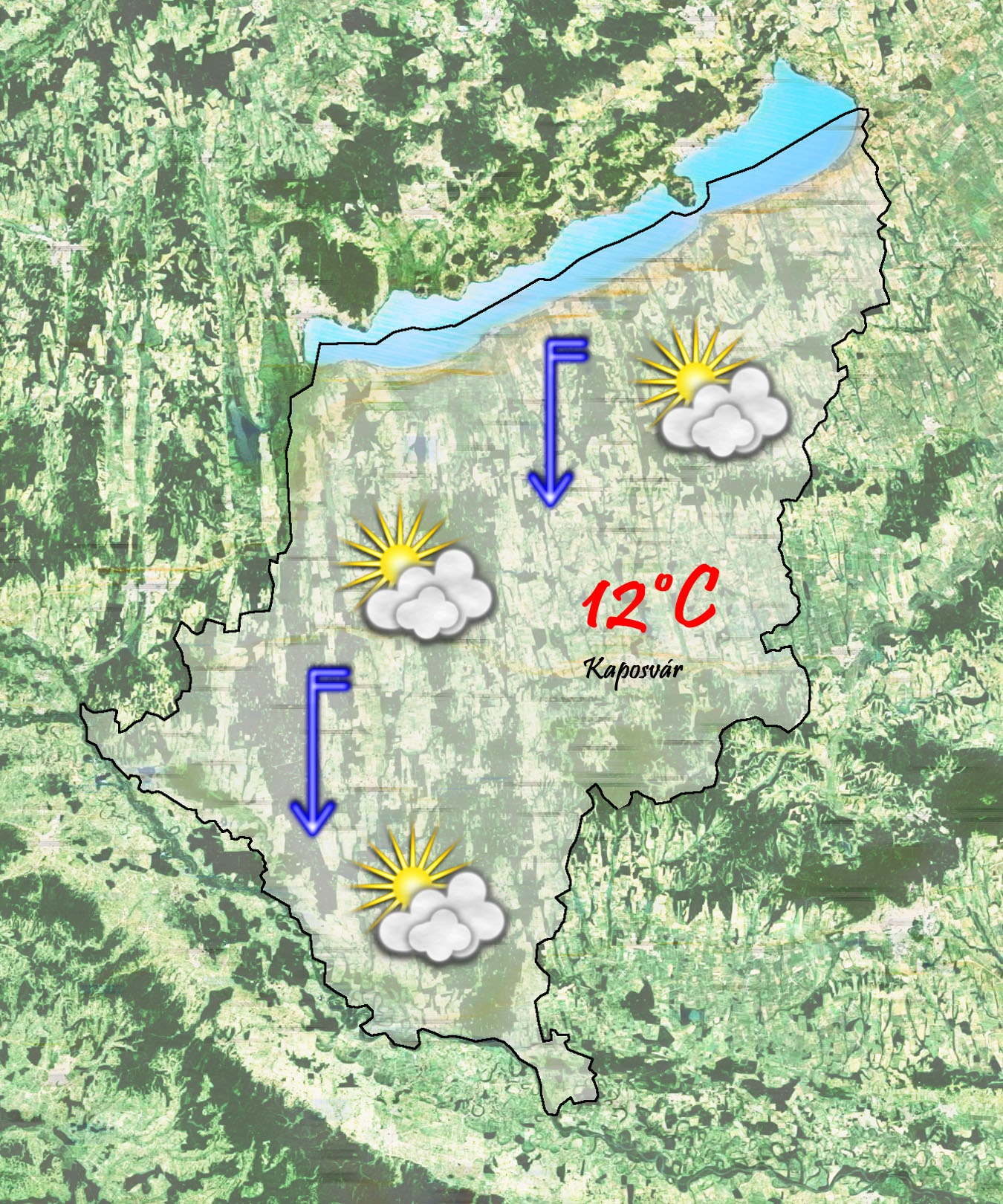 Kedd reggel változóan felhős lesz az ég. Sokfelé képződik majd pára és köd. -1 °C-ig csökkena hőmérséklet. Napközben erősen felhős lesz az ég, de ennek ellenére 15 °C-ig is felkúszhat a hőmérő higanyszála. Hidegfront érkezik, azonban az Alpok hatására a meleg főnszél fog északnyugat felől fújni.