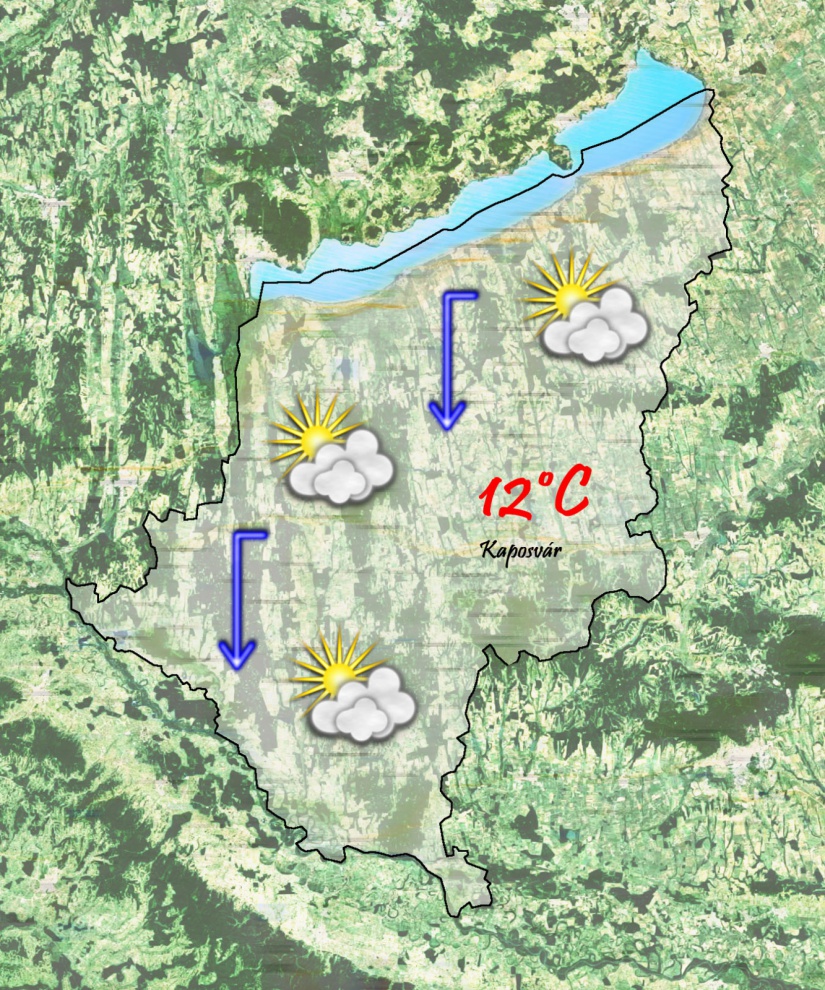 Szerdán reggel 2°C-ig csökken a minimumhőmérséklet. Gyenge talajmenti fagyra lehet számítani. Napközben a változóan felhős ég mellett gyenge északi szél fúj majd. 12°C-ig melegszik a levegő a délutáni órákra.