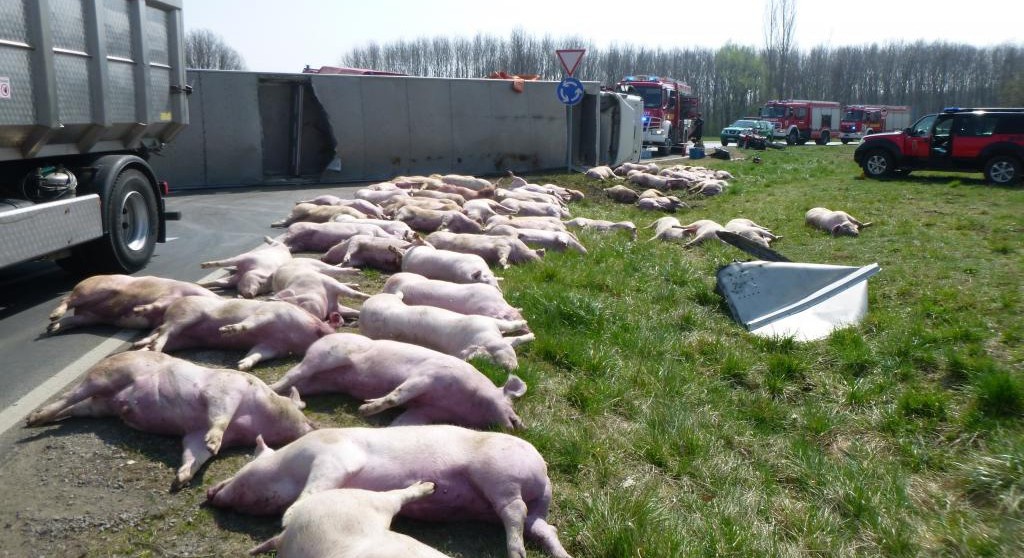 Oldalára borult egy sertésszállító kamion a 61-es főúton, a taszári körforgalomnál hétfő délelőtt. Több állat elpusztult a baleset következtében.