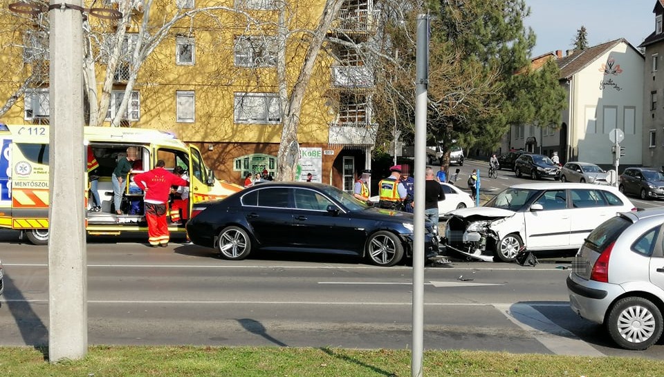 Berzsenyi utcában a Tesco előtti kereszteződésben történt a baleset. Két autó ütközött és mentő is érkezett, a gyalogosoknak jelző közlekedési lámpa is kidőlt.
