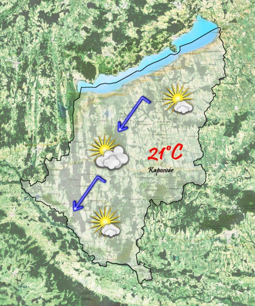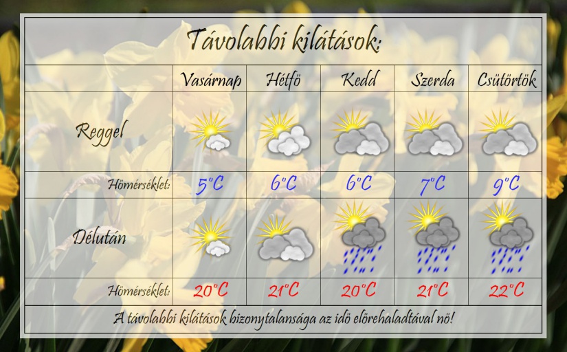 Vasárnap reggel 4 °C-ig csökken a levegő hőmérséklete. Megnövekszik a felhőzet. Délutánra 22 °C-ig melegszik a levegő. A napsütést sokszor zavarják majd a gomolyfelhők az égen. Gyenge nyugatias szél fog fújni, ami időjárásváltozást hoz majd.