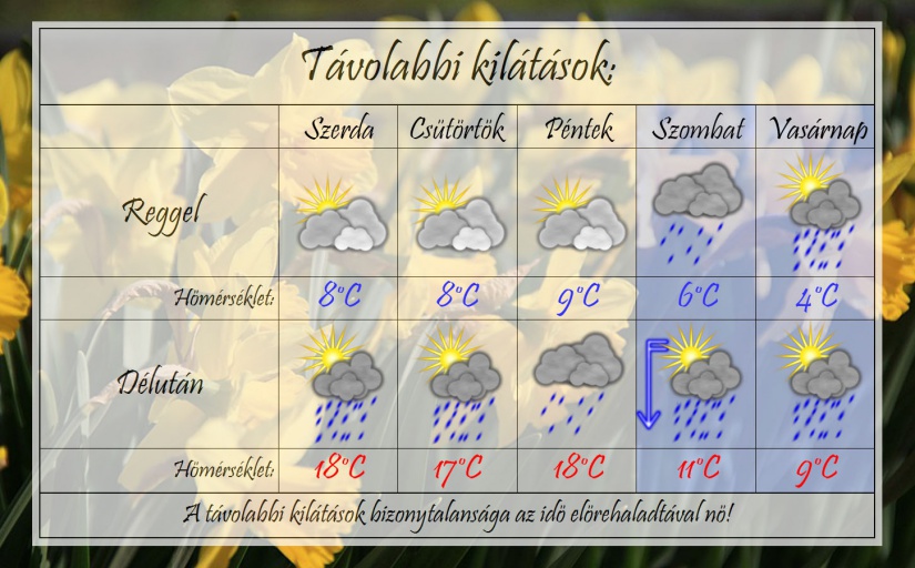 A hét második felében folytatódik a borongós-erősen felhős idő. Reggelente 10 °C-ig hűl a levegő, míg napközben elérheti a 18-20 °C-ot a hőmérséklet. A hétvégén komoly lehűlés valószínű csapadékkal és viharos széllel.