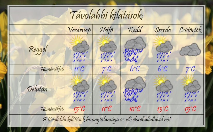 A jövő hét elején viharos széllökésekkel lehűlés kezdődik és csak 10-15°C között lesz a maximumhőmérrséklet. Hétfőn sokfelé lehet majd zápor és zivatar, valamint délutántól eső is előfordulhat. Kedd nagy bizonytalanság mellett esősnek ígérkezik. A hét többi napján is lehet majd csapadék. Meglehetősen nyugtalan lesz az időjárás. Gyakorlatilag őszies időre lehet majd számítani egyes napokon.