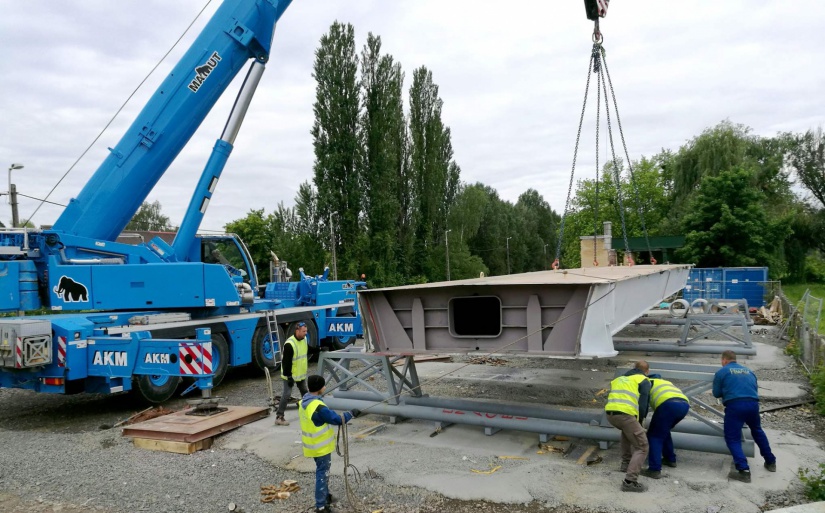 35 tonna és 24 méter hosszú - megérkezett Kaposvárra az új gyalogos-kerékpáros felüljáró legnagyobb darabja, amelyet óriásdaru emelt le a túlméretes szállítmányokhoz gyártott kamionról.
