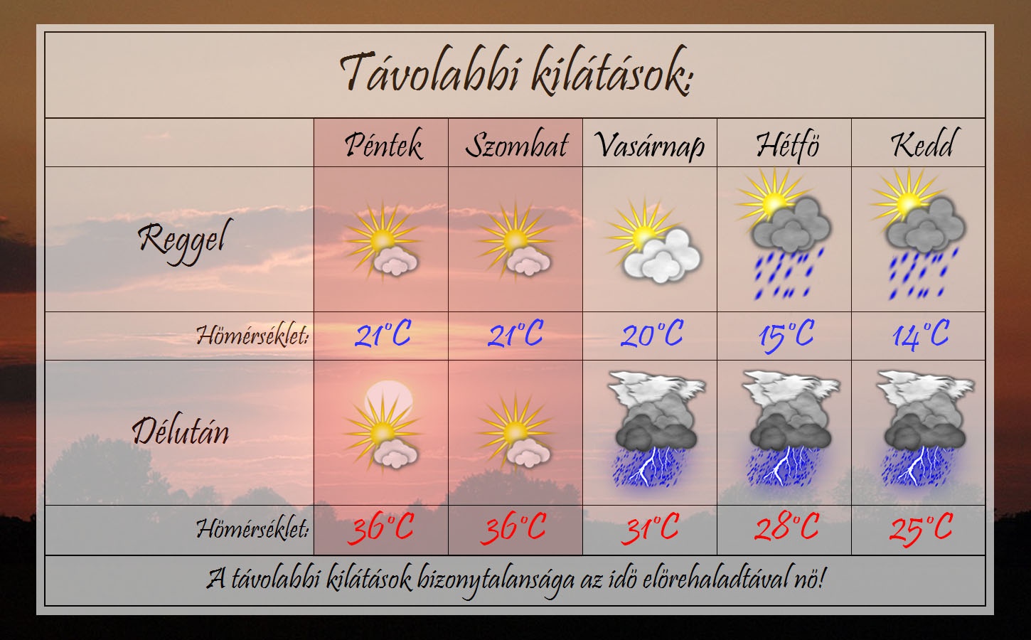 Péntek reggel 21°C-ig csökken a minimumhőmérséklet. A napsütést csak néha zavarhatják meg a gomolyfelhők. 36°C-ig melegszik a levegő a délutáni órákra.