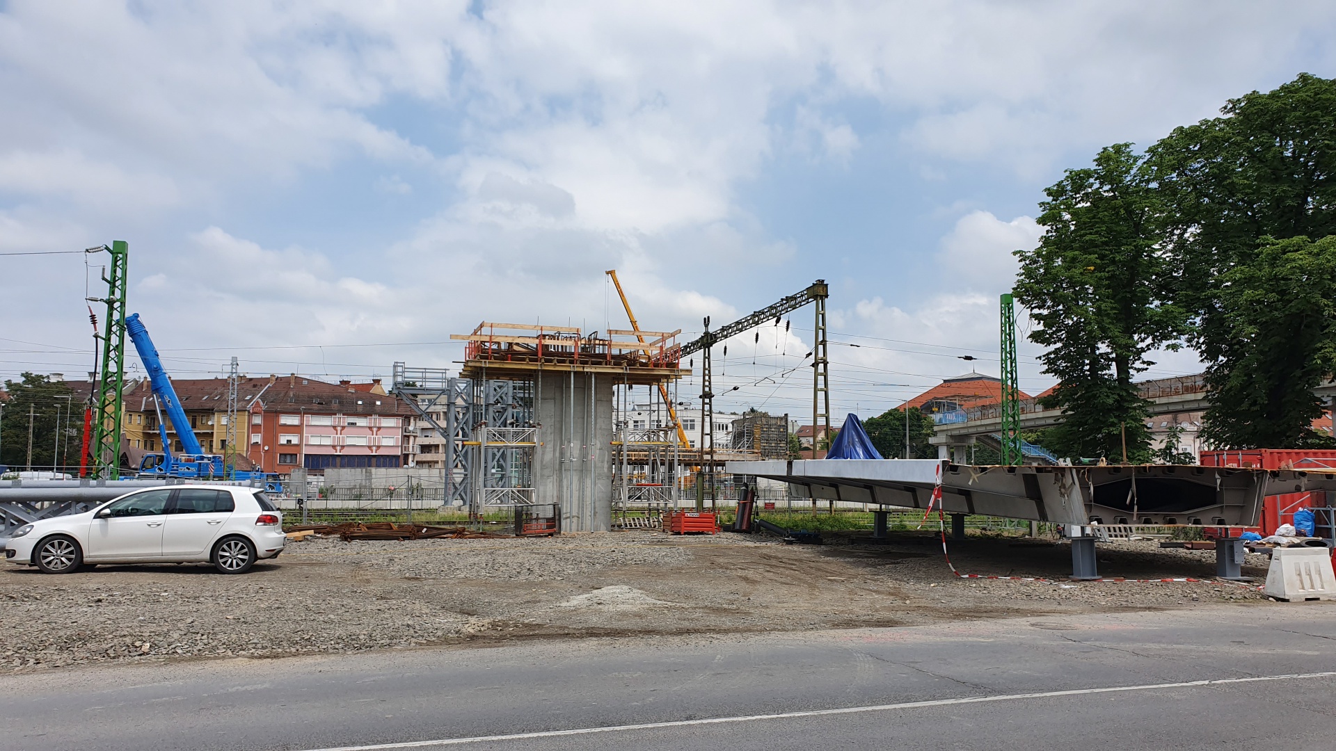 Az óriásdaru ezért át is települt a donneri oldalról, ott segíti már a nehéz elemek mozgatását. Ezzel párhuzamosan a közművek kiváltása a végéhez közeledik, így megkezdődhetett az Áchim András utca új, módosított szakaszán a földmunka.