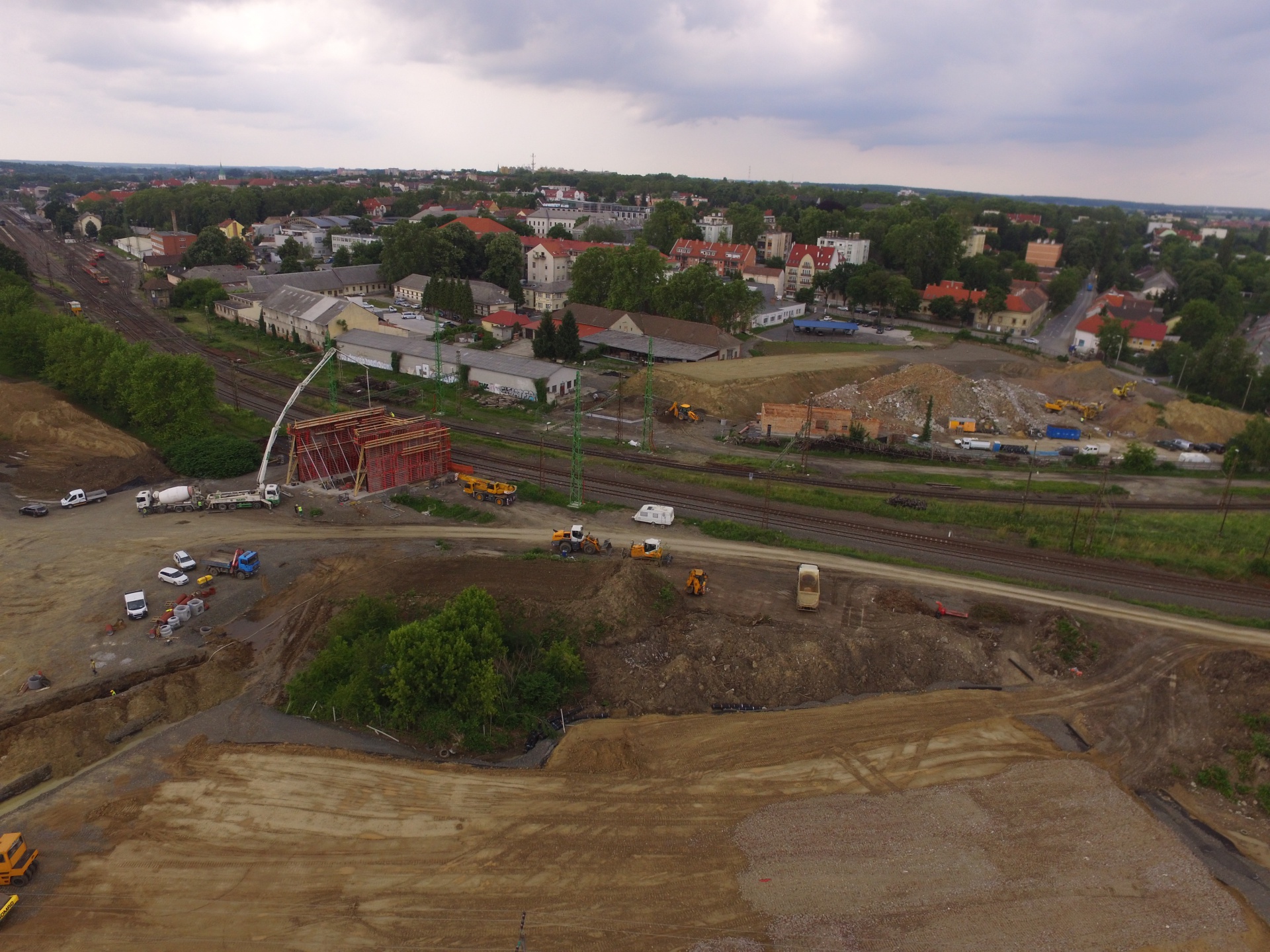 Újabb segédtámasztékok jelzik, hogy Kaposvár új gyalogos-kerékpáros hídja már a vasúti sínek mindkét oldalán épül. Eddig csak a Gilice utca mentén kialakított összeszerelő területre érkeztek Budapestről a több tíztonnás darabok, mostantól viszont a belvárosban is zajlik az összeszerelés és hegesztés, hogy a július közepétől érvénybe lépő vágányzár alatt a kivitelező beemelhesse a hídszerkezetet a sínek fölé. Az új, nyolcméter széles felüljáró szerkezete szeptember elejére már látható lesz.