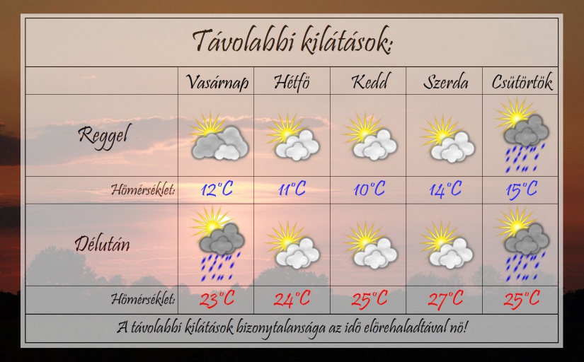 Vasárnap reggel 13 °C-ig csökken a levegő hőmérséklete. Napközben változóan felhős lesz az ég és kevesebb csapadék várható. Zápor, esetleg zivatar előfordulhat. A ciklon keletre távozik. Délután 21 °C-ig melegszik a levegő. Gyenge északnyugati szél fúj továbbra is.