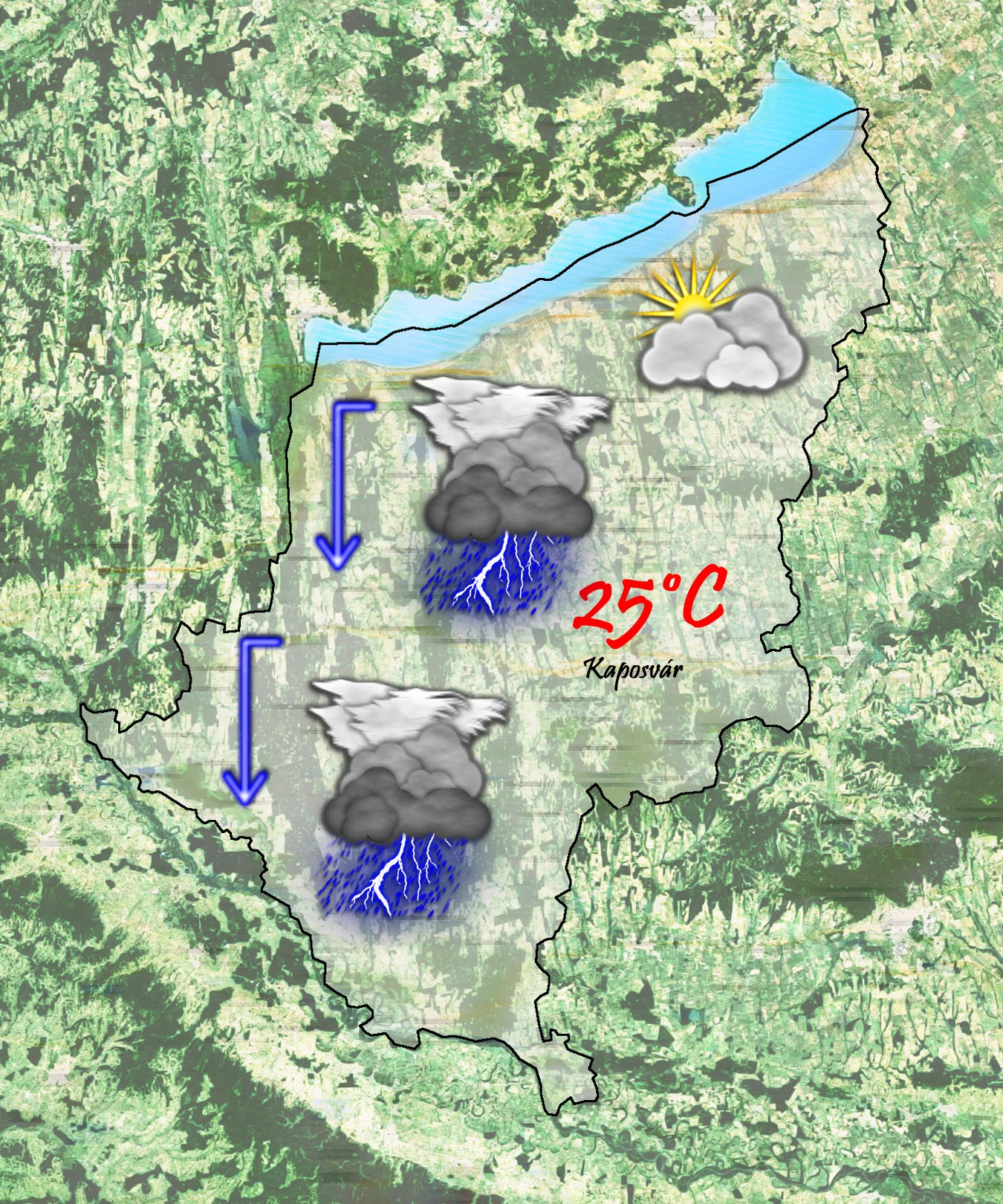 Kedd reggel a közepesen, felhős ég alatt 19 °C-ig csökken a hőmérséklet. Szinte a nap egészében várható csapadék zápor és zivatar formájában. 30 °C-ig kúszik fel a hőmérő higanyszála. Gyengén fúj majd az északnyugati szél.