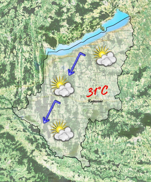 Szerda délután közepesen-erősen felhős lesz az ég. 30 °C-ig melegszik a levegő hőmérséklete. Csapadék néhol előfordulhat kisebb zápor formájában. Mérsékelt, olykor élénk északi szél fog fújni.