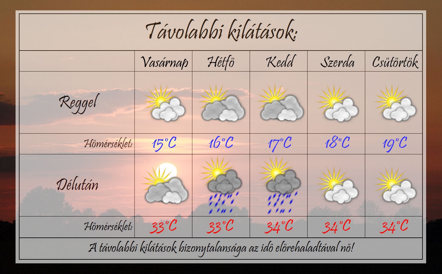 Vasárnap reggel 18 °C-ig csökken a levegő hőmérséklete. Napközben változóan felhős idő várható és előfordulhat zápor, esetleg zivatar. Délutánra 33 °C-ig melegszik a levegő. Gyenge keleti szél fúj továbbra is.