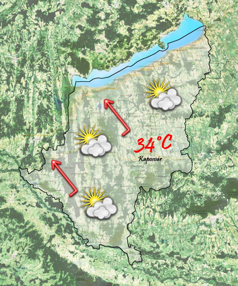 Csütörtök reggel gyengén felhős lesz az ég és 19°C-ig csökken a hőmérséklet. Délután 34°C-ig kúszik fel a hőmérő higanyszála. Végig meleg, nyugodt, nyárias idő várható gyenge délkeleti széllel.