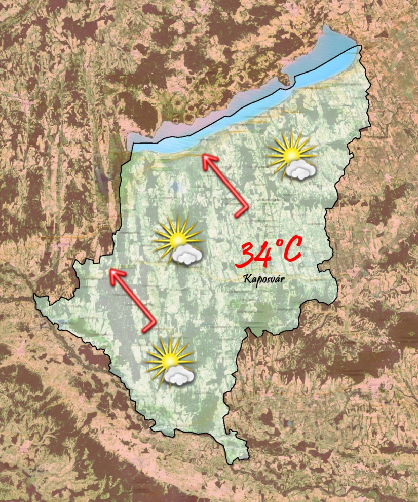 Vasárnap reggel 19 °C-ig csökken a levegő hőmérséklete. Napközben gyengén felhős idő várható sok napsütéssel. Délutánra 34 °C-ig melegszik a levegő. Gyenge délkeleti szél fog fújni.