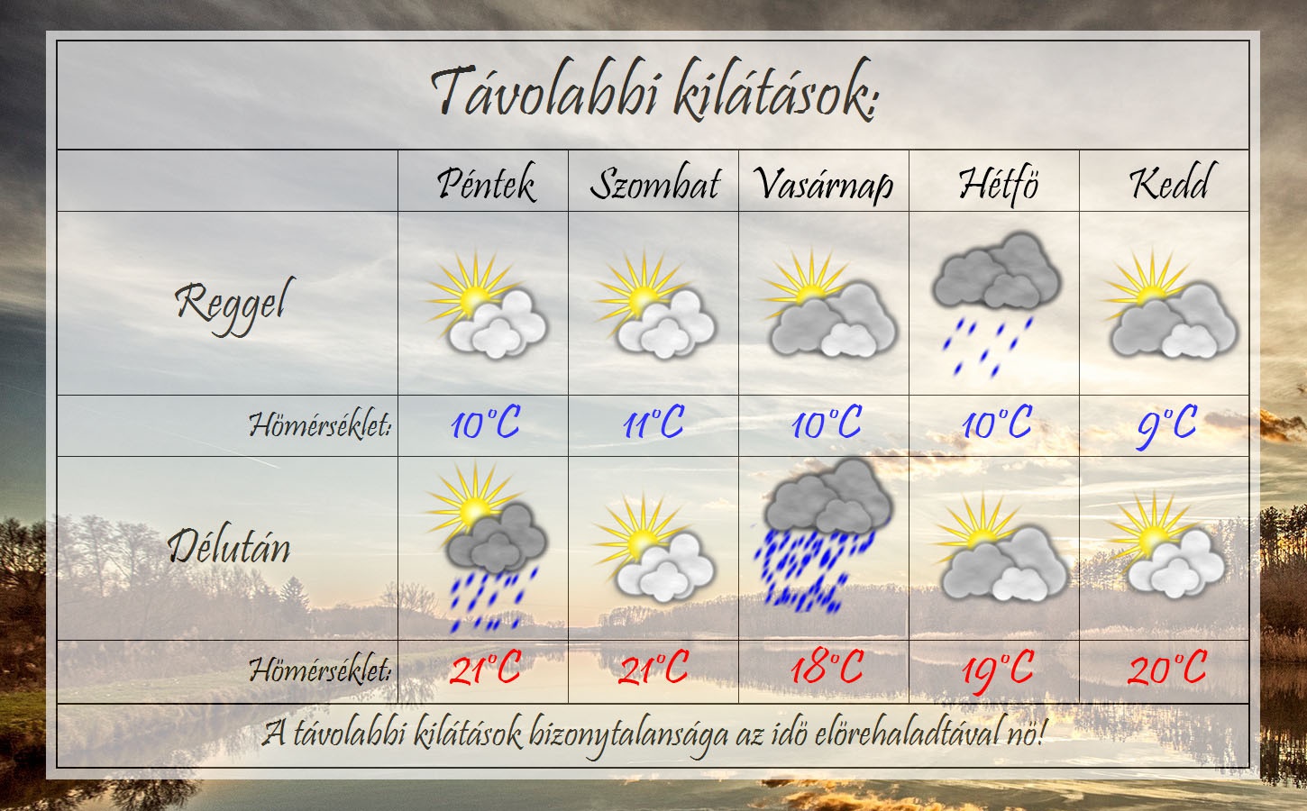 Péntek reggelre 12 °C-ig hűl a levegő. Napközben egy gyenge hidegfront érkezik, melyből szórványosan előfordulhat kisebb eső, zápor. Délután 21°C-ig emelkedik a hőmérséklet. Megélénkül az északnyugati szél.