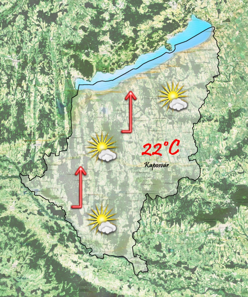 Csütörtök reggel változóan felhős lesz az ég és 11°C-ig csökken a hőmérséklet. Napközben már sok napsütésre számíthatunk. Délután 23°C-ig kúszik fel a hőmérő higanyszála. Gyengén fúj majd a déli szél.