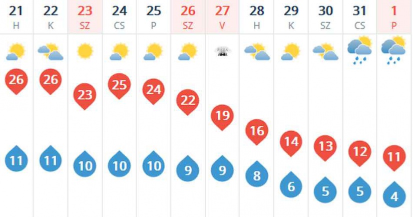 Keddre, szerdára és csütörtökre virradó éjszaka többfelé képződhet köd, amelyből előfordulhat szitálás. Napközben napos, alapvetően csapadékmentes idő várható. A legalacsonyabb hőmérséklet kedden 6-13, szerdán 5-12, csütörtökön 5-13 fok között valószínű. A legmagasabb hőmérséklet kedden többnyire 22-27, szerdán 20-26, csütörtökön 21-27 fok között alakul, ugyanakkor a tartósabban ködös tájakon ennél pár fokkal hűvösebb lesz.