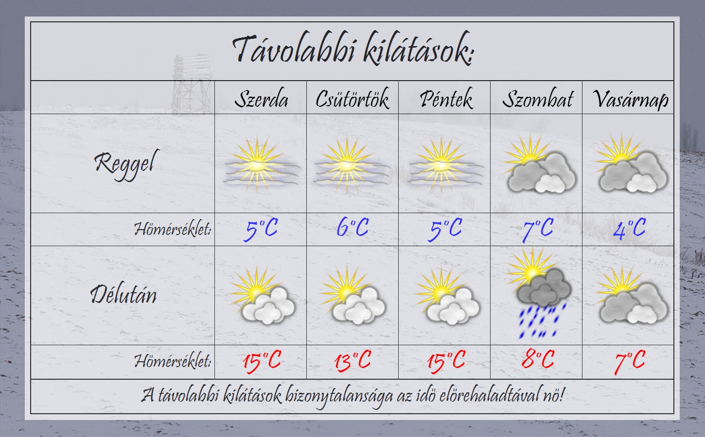 A reggelek fagymentesek lesznek, míg délutánonként eléri a hőmérséklet a 15°C-ot a fátyolfelhős ég mellett. Koratavaszias idő várható.