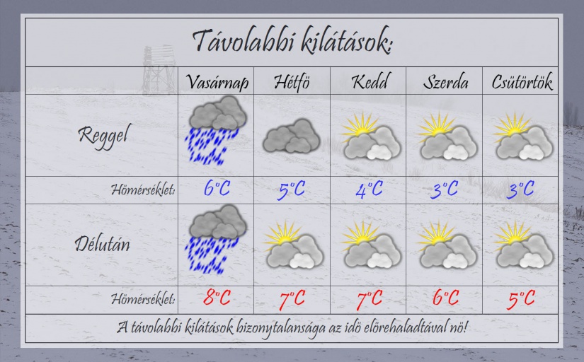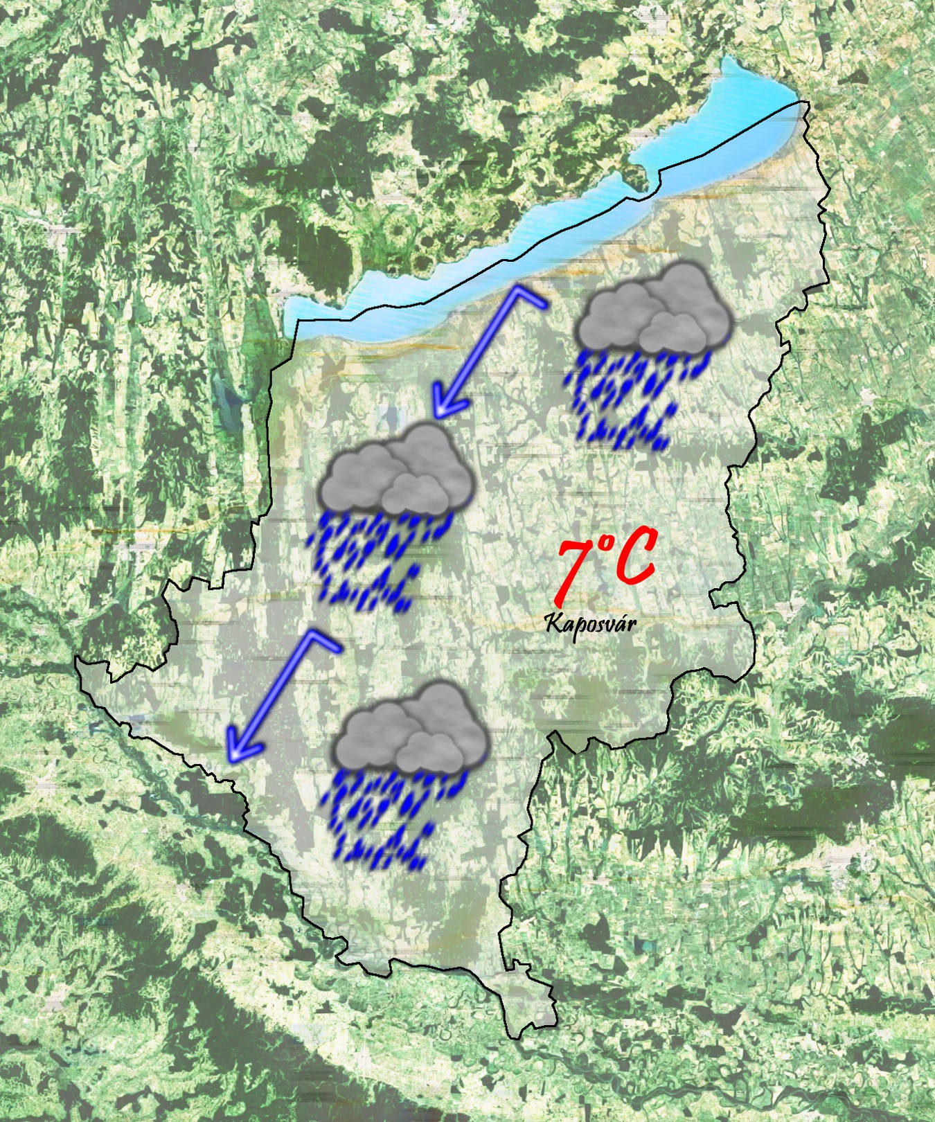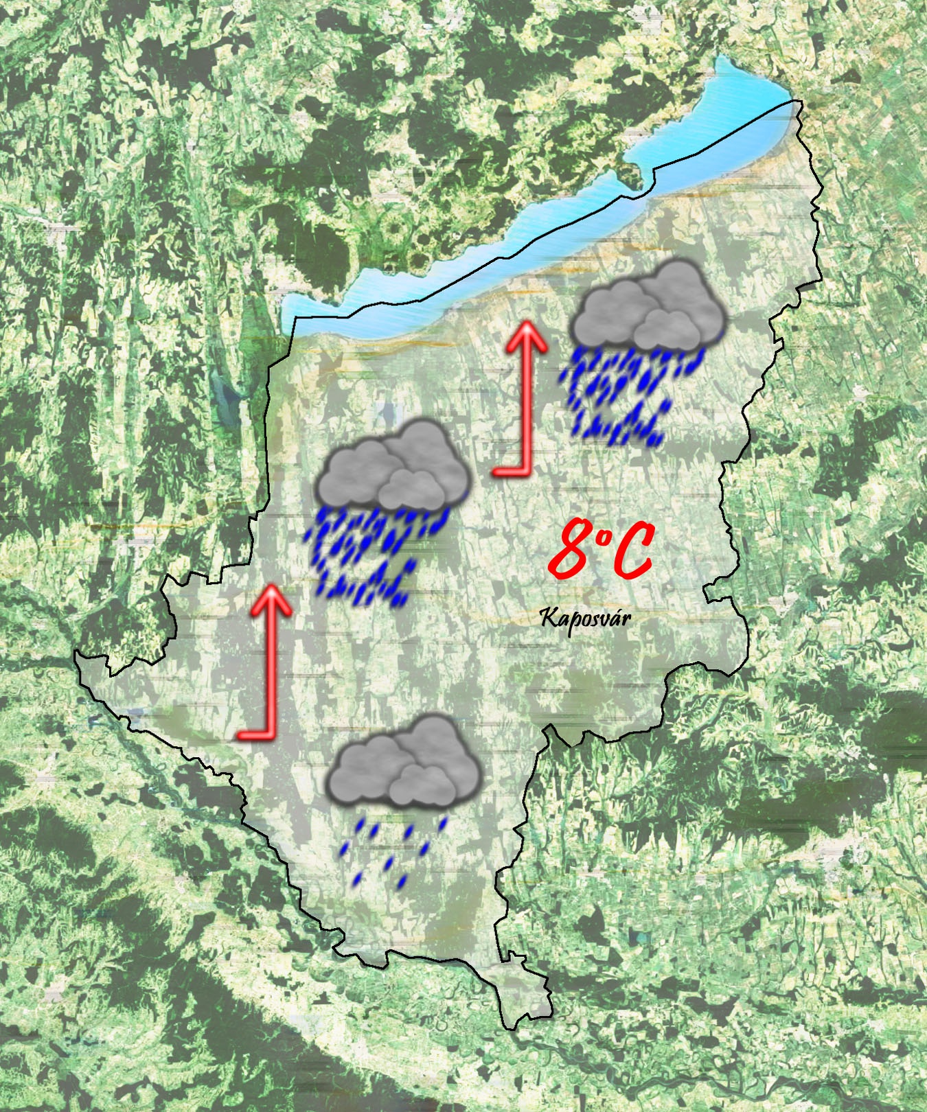 Vasárnap reggel a borult ég alatt csak 6°C-ig zuhan a levegő hőmérséklete, míg délutánra 10°C-ig melegszik a levegő. Újabb csapadékzóna érkezik, mely kiadós esővel jár majd. Gyenge, olykor mérsékelt északkeleti szél fog fújni.