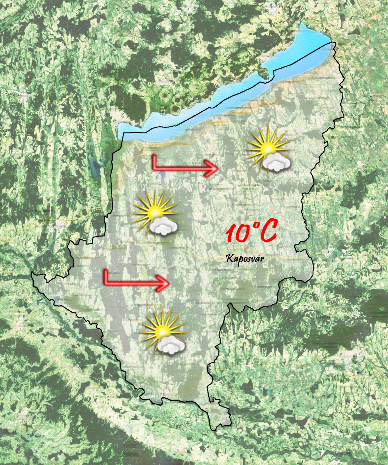 Szombat reggel erősen felhős lesz az ég. Egy hidegfront érkezik. 0°C-ig csökken a hőmérséklet. Napközben csökken a felhőzet és csapadék sem várható. Az északnyugati szél megélénkülhet. 7°C-ig emelkedik a hőmérséklet.