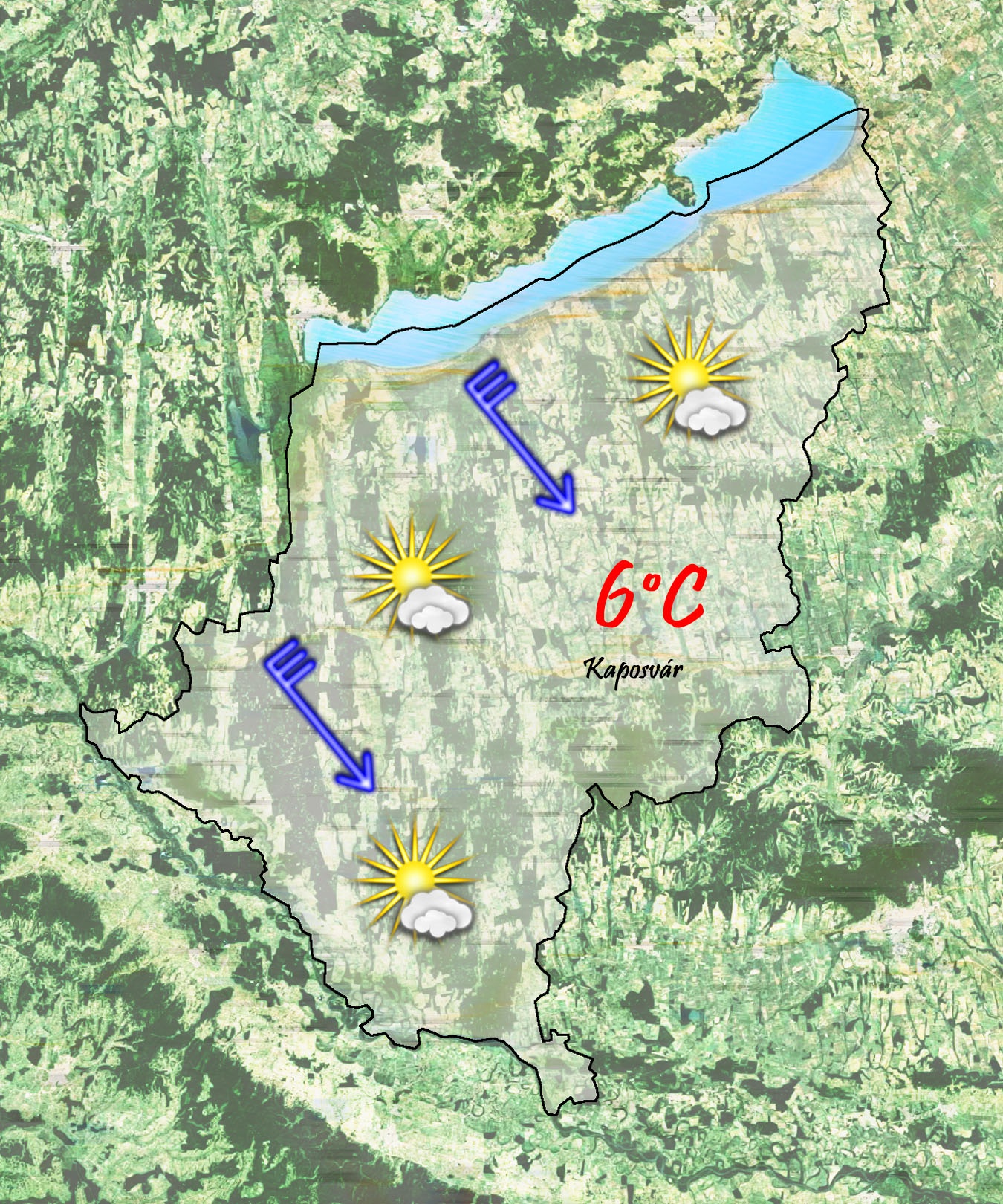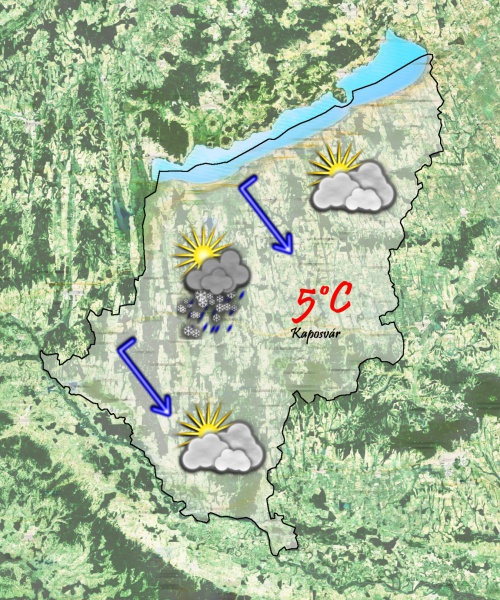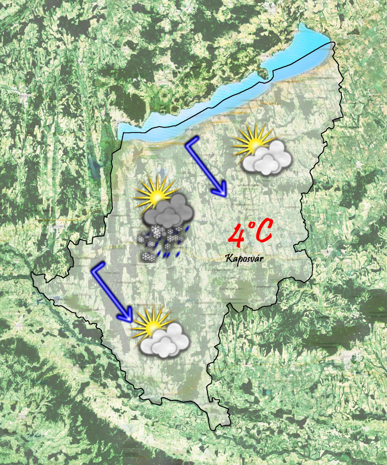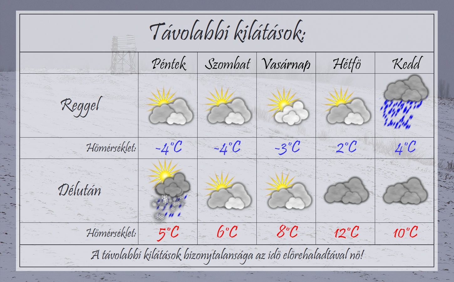 Csütörtök reggel közepesen felhős lesz az ég és -3°C-ig csökken a hőmérséklet. Délután változóan, olykor erősen felhős lesz az ég, és előfordulhat egy-egy havaseső, zápor. 5°C-ig kúszik fel a hőmérő higanyszála. Az északnyugati szél mérséklődik.