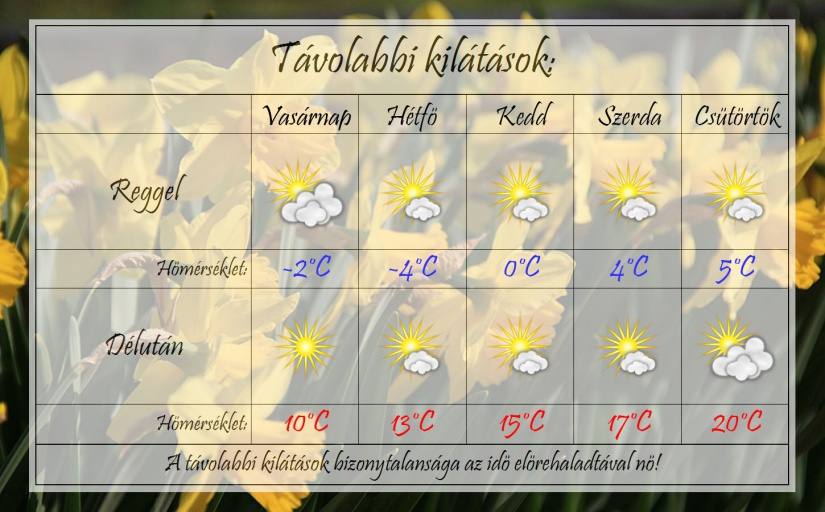 A jövő héten igazi tavaszi idő várható. Eleinte még lehet talajmenti fagy reggelente, majd később megenyhülnek a hajnalok is. Napközben egyre inkább eléri a hőmérséklet a 15°C-ot, míg a hét második felében át is lépi azt. Kevés felhő és sok napsütés vár ránk.