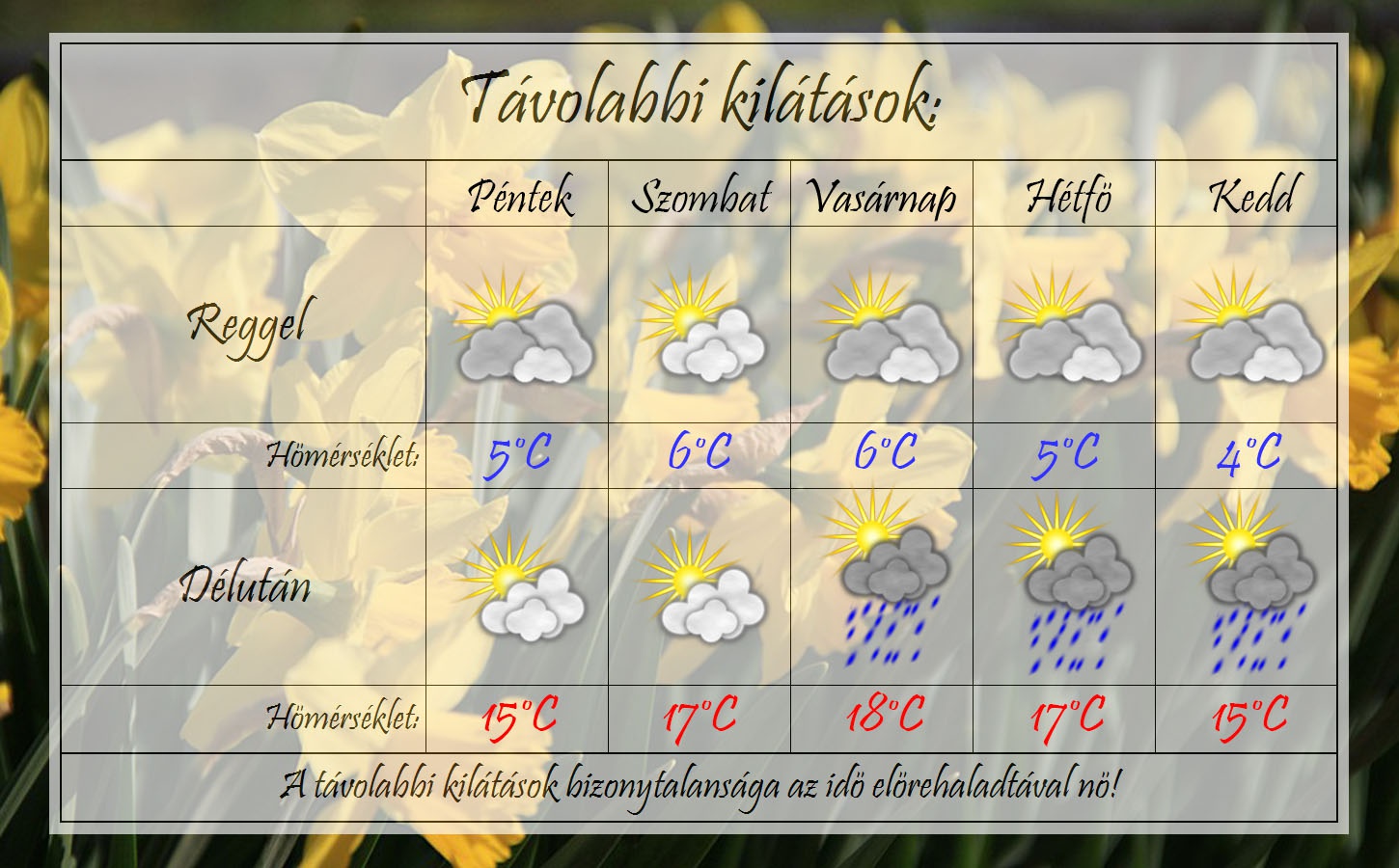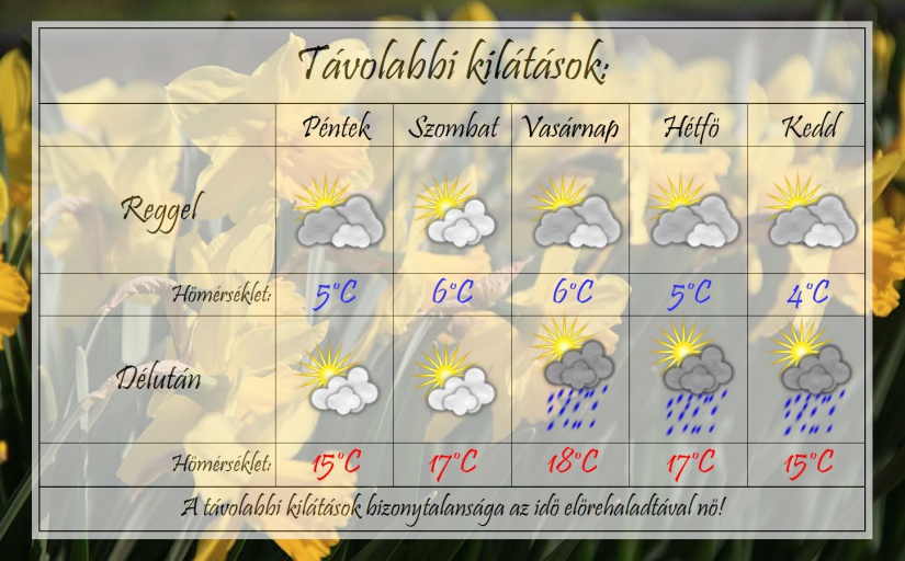 A hétvégén szinte tavaszias idő várható. A reggeli fagyok teljesen megszűnnek, míg délután a hőmérséklet majdnem eléri a 20°C-ot. Eleinte kevés felhő lesz az égen, majd vasárnap kicsivel több felhő érkezhet és záporeső is lehet. A jövő héten lehűlésre van esély.