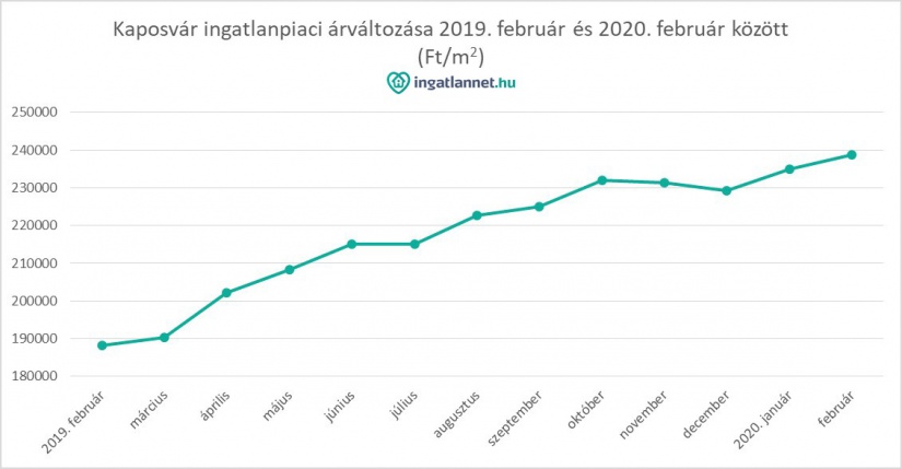 Az elmúlt egy év során Kaposvár területén közel 21 százalékos ingatlanár-növekedésnek lehettünk szemtanúi. Az Ingatlannet.hu adatai alapján kiderül, hogy a tavalyi év februárjában az eladásra kínált ingatlanok átlagára 188 ezer Ft/m2 volt, ezzel szemben 2020 februárjára ez az összeg elérte 238 ezer forintos négyzetméterárat is. Jól látható, hogy városunk ingatlanáraiban a két időszak közötti különbség megközelítette az 50 ezer forintot.