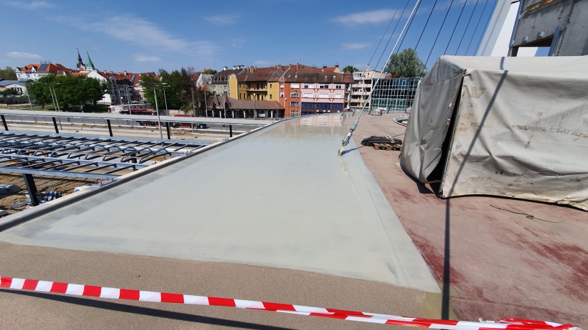 A köztes szakaszon pedig egyre látványosabban halad az acélszerkezetű híd kivitelezése. Az elmúlt hetekben megtörtént a felület érdesítése, majd alapozása, s a korlátok fogadószelvényeit is a helyükre hegesztették.