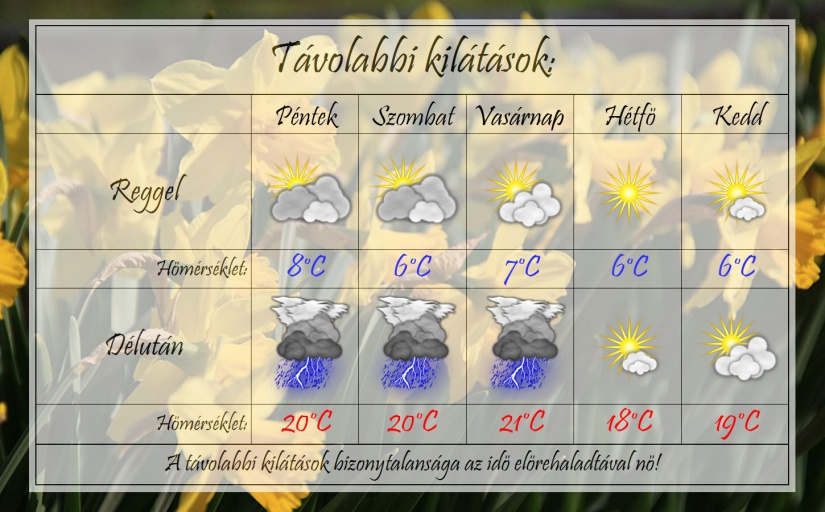 Szombaton egy gyenge hidegfront hatására előfordulhat kisebb záporeső, de komoly lehűléstől nem kell tartani, míg vasárnap nyugodtabb és friss tavaszias idő várható, de elszórtan újabb záporokra van kilátás. A jövő hét első felében az időjárás teljesen megnyugszik és sok napsütésre van esély. Reggelente 5 és 10°C között lesz a minimum, míg délutánonként 20°C-ig kúszik fel a hőmérő higanyszála.