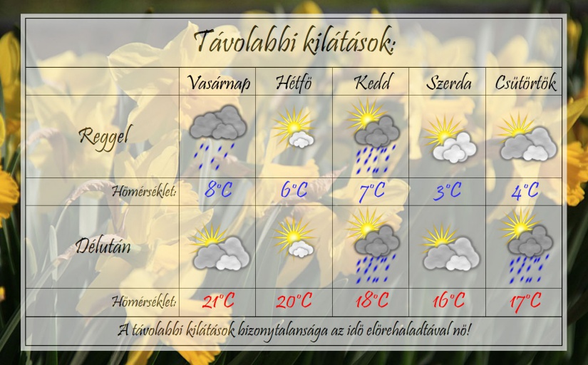 A jövő hét elején hétfőn szikrázóan napos, derült idő várható, majd kedden egy erős hidegfront hatására lehet majd zápor, akár hidegfront. Szerdán a front elvonulása után kissé hűvös idő várható egy-egy záporral.