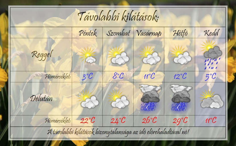A hétvégén koranyár várható. Vasárnap előfordulhat zápor, zivatar a 25°C-ban. Reggel nem lesz hűvös a hét utolsó napjain. Hétfőn este markáns hidegfront hoz 15°C-os lehűlést, emiatt kedden igen szeles, hideg idő lehet megint és közel lesz a hajnali hőmérséklet a 0°C-hoz.