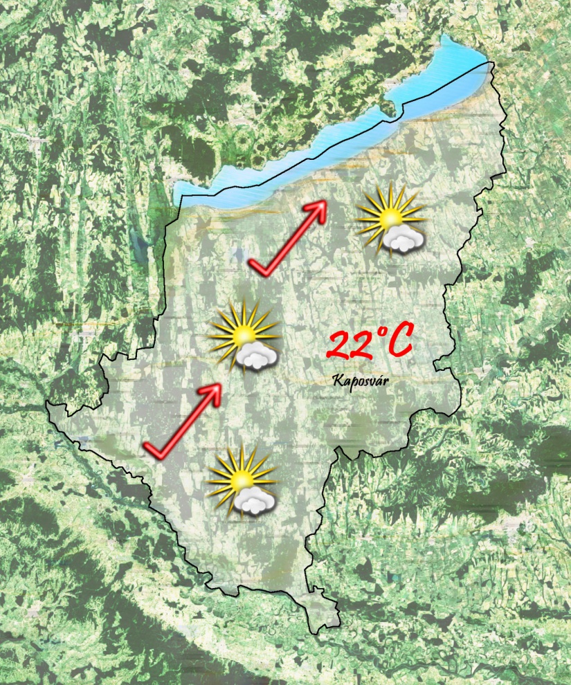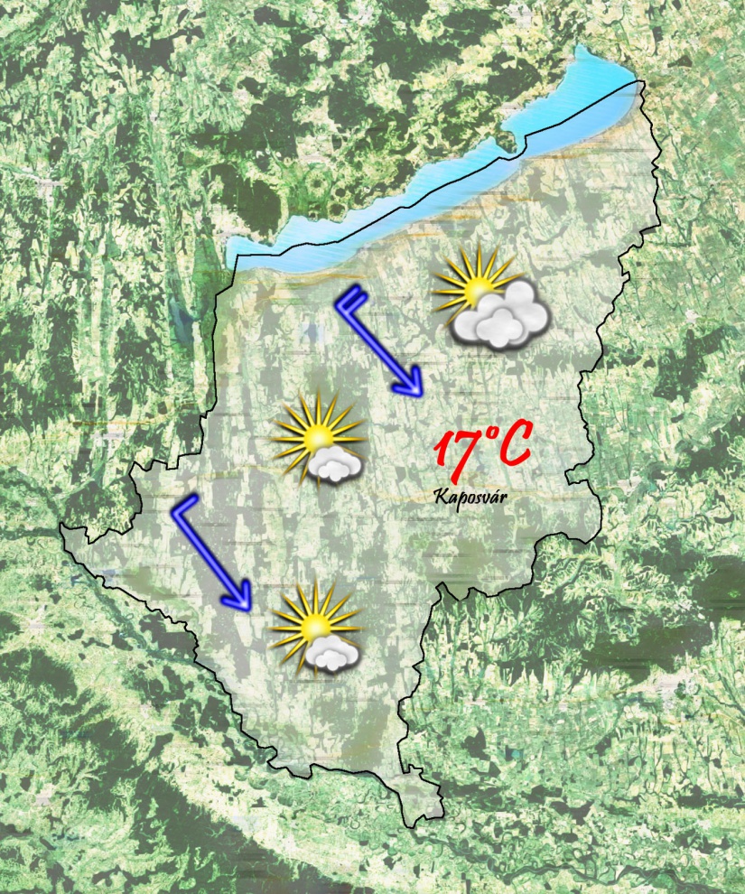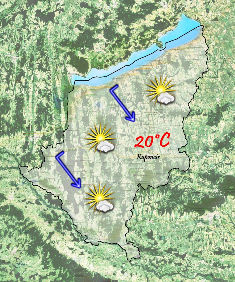 Csütörtök reggel gyengén felhős lesz az ég . 5°C-ig süllyed a hőmérő higanyszála. Délután pedig 20°C-ig melegszik a levegő. Gyengül az északnyugati szél.