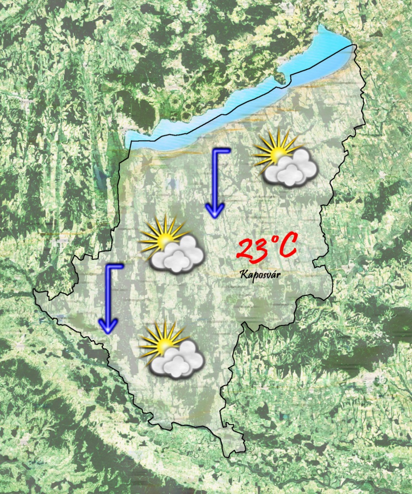 Csütörtök reggel gyengén felhős lesz az ég. 8°C-ig süllyed a hőmérő higanyszála. Napközben változóan felhős idő lesz. 21°C-ig melegszik a levegő. Gyenge északi szél fúj majd.