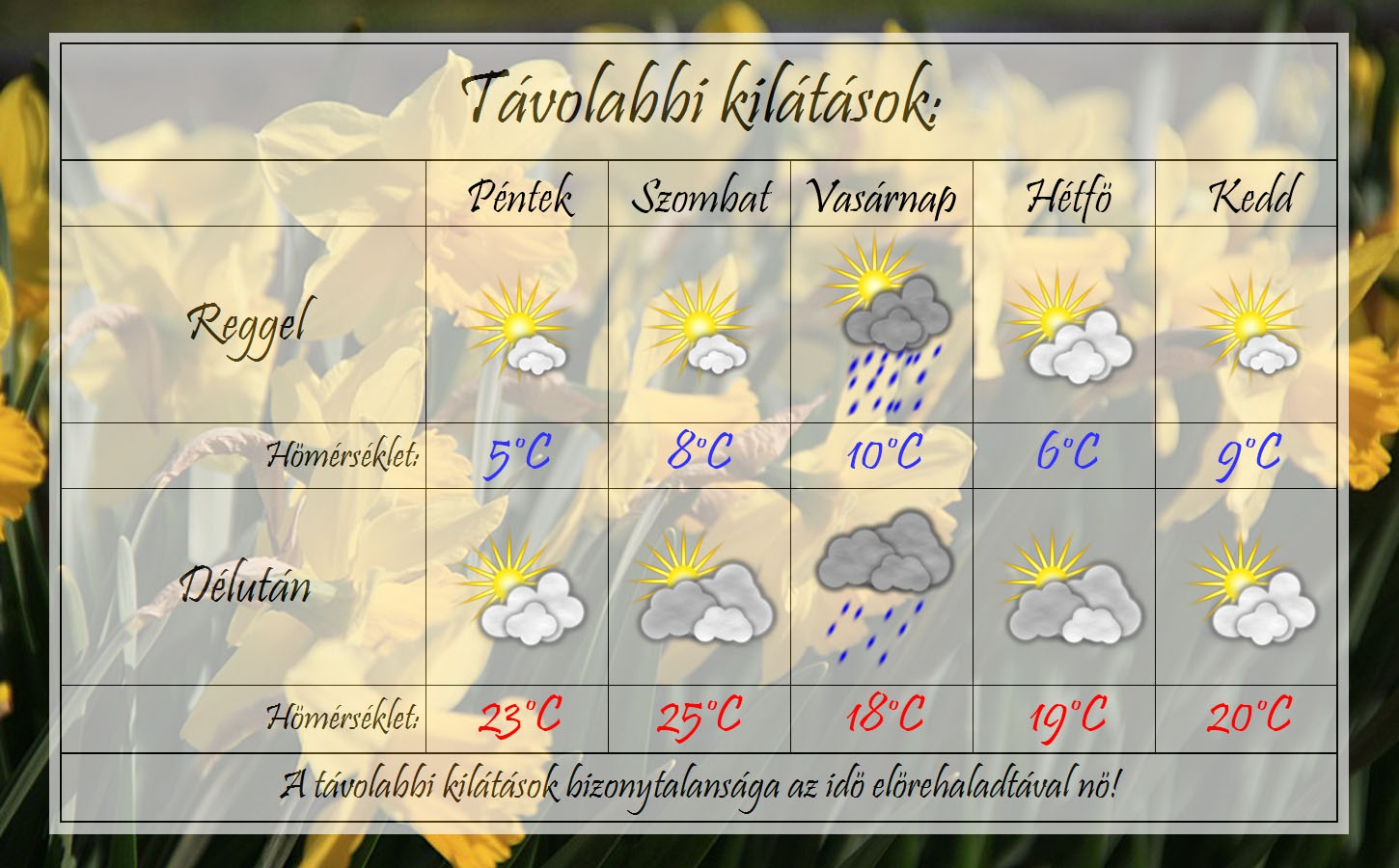 Péntek reggelre meglehetősen hűvös lesz. 5°C-ig hűl a levegő, majd délután 22°C-ig emelkedik a hőmérséklet. Változóan felhős lesz az ég és továbbra is gyenge északi szél fog fújni.