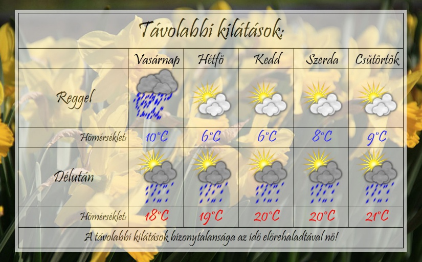 A jövő héten reggelente nyugodt idő várható, majd délutánonként megszaporodnak a gomolyfelhők és egyre több helyen lehet zápor, esetleg zivatar. A hőmérséklet kicsit visszafogott lesz, csak 20 °C körül alakul a nappali maximum, míg reggelente 10 °C alá hűl a levegő. Az uralkodó szél északi lesz, mely jelzi, hogy még áramlik a térségbe a sarkvidéki hideg levegő.
