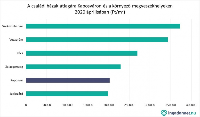Összevetettük a kaposvári házak árát a szomszédos megyeszékhelyek áraival is, melynek következtében kiderült, hogy Kaposvár volt a második legolcsóbb az áprilisi hónapban. Szekszárd alig maradt le a maga 198 ezer Ft/m2-es átlagárával városunktól. A Zalaegerszegen eladó házak már valamivel drágábbnak bizonyultak az áprilisi hónapban, ott 228 ezer Ft/m2-es átlagáron kínálták eladásra ezeket az ingatlanokat. Ennél jóval drágábbak voltak a házak Pécs és Veszprém területén, elérték a 269, illetve utóbbinál a 343 ezer forintos négyzetméterenkénti átlagárat is. A lista első helyén Székesfehérvár végzett, ahol átlagosan 372 ezer Ft/m2 volt az eladó házak árfekvése.
