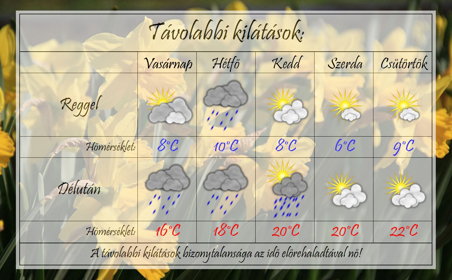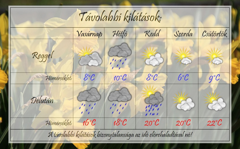 Vasárnap reggel eleinte kevesebb, majd később több felhőre lehet számítani. 8 °C-ig süllyed a levegő hőmérséklete. Napközben előfordulhat kisebb eső, zápor. Megélénkülhet az északnyugati szél és mellette csak 15 °C-ig kúszik fel majd a hőmérséklet.