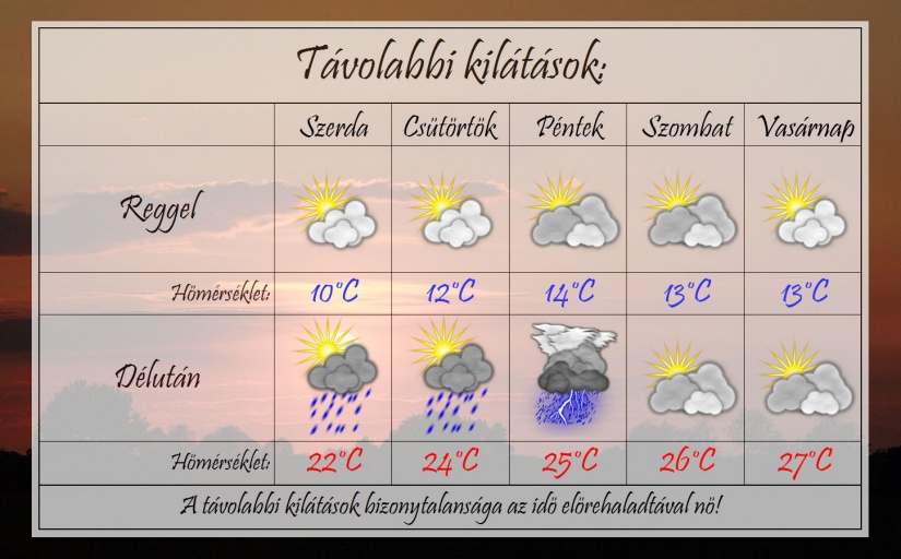 A hét második felében változás kezdődik időjárásunkban. Az eddig uralkodó északnyugati szél átfordul délnyugatiba és meleg légtömegek érkeznek. Ám a meleg mellett több nedvesség is érkezik és emiatt ismét sokfelé lehet majd zápor, zivatar, főként pénteken. A nappali maximumhőmérsékletek egyre magasabbra kúsznak majd, míg reggelente is melegebb lehet.