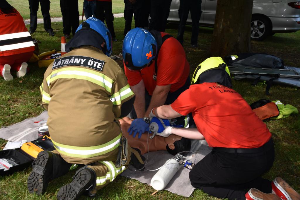 A gyakorlat első feltételezése szerint a művelődési házban tűz ütött ki, ahol két ember bent rekedt. A riasztást követően a beavatkozók a feladatot gyorsan és szakszerűen végezték el. Áramtalanították az épületet, elzárták a gázvezetéket, majd légzőkészüléket használva védősugár fedezetével megkezdték az életmentést és az oltást. Az épületben rekedt két sérültet kimentették és eloltották a tüzet. Ezt követően egy közlekedési balesetnél kellett helytállniuk az önkénteseknek, ahol a roncsba szorult sofőrt feszítő-vágó berendezéssel szabadították ki.